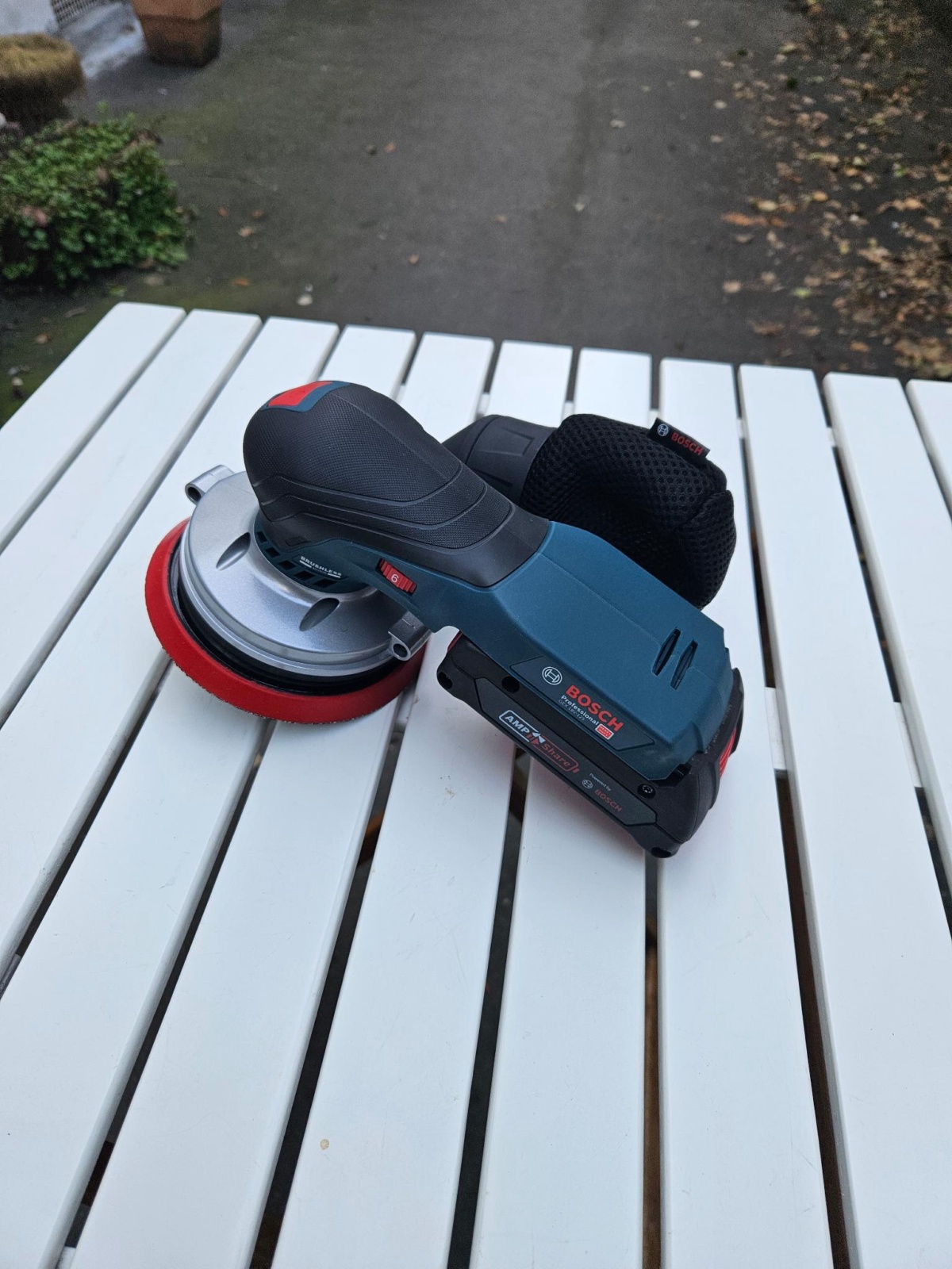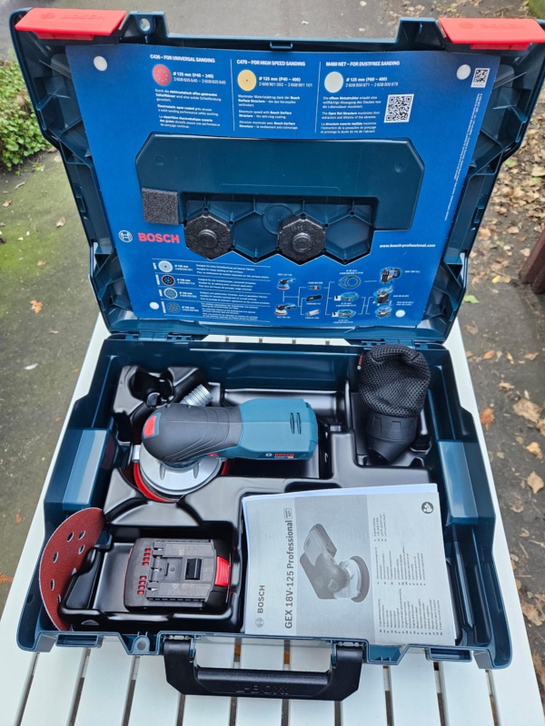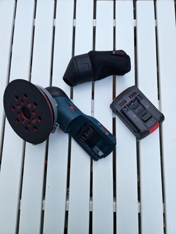 Bosch Akku-Handschleifgerät mit Staubbeutel.